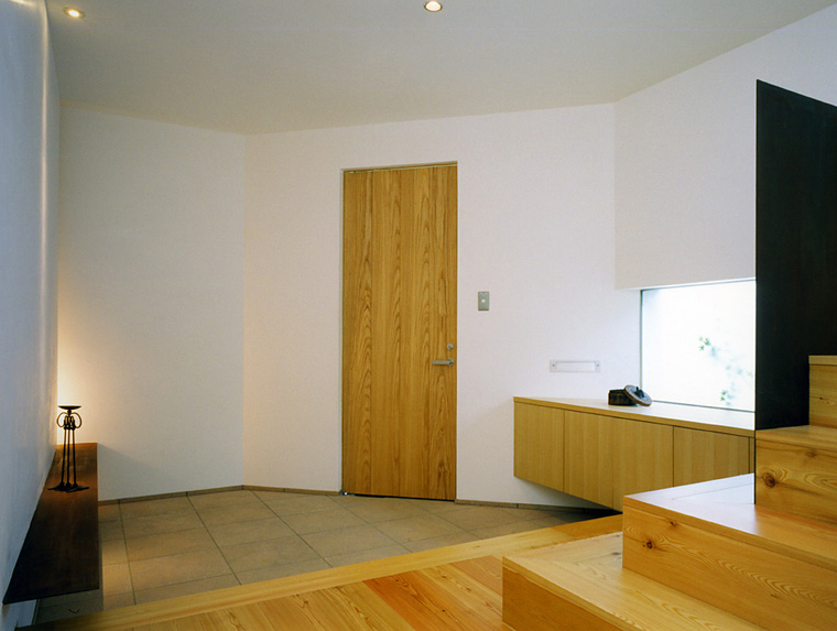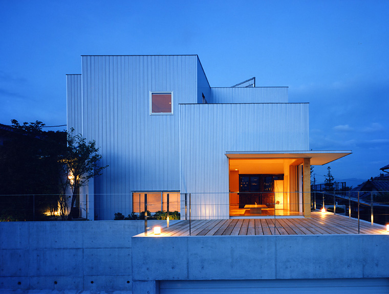この家は、2階をプライベートなスペース、1階は客を迎え、時には作品の展示の場としても使える空間として計画された。キュービックで銀色の外観は、周囲とは際だち自立する。しかし、深い緑を背景に、刻々と変化する光や緑といった自然を微妙に映し、穏やかに表情を展開する。