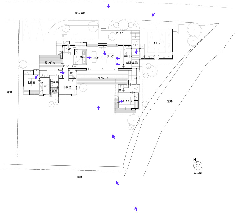 周りの自然を様々に採り入れ交錯しながら連続する内外空間は、日々趣きの異なる景色を感じながら、住まいとしての落ち着きのある場を生み出している。